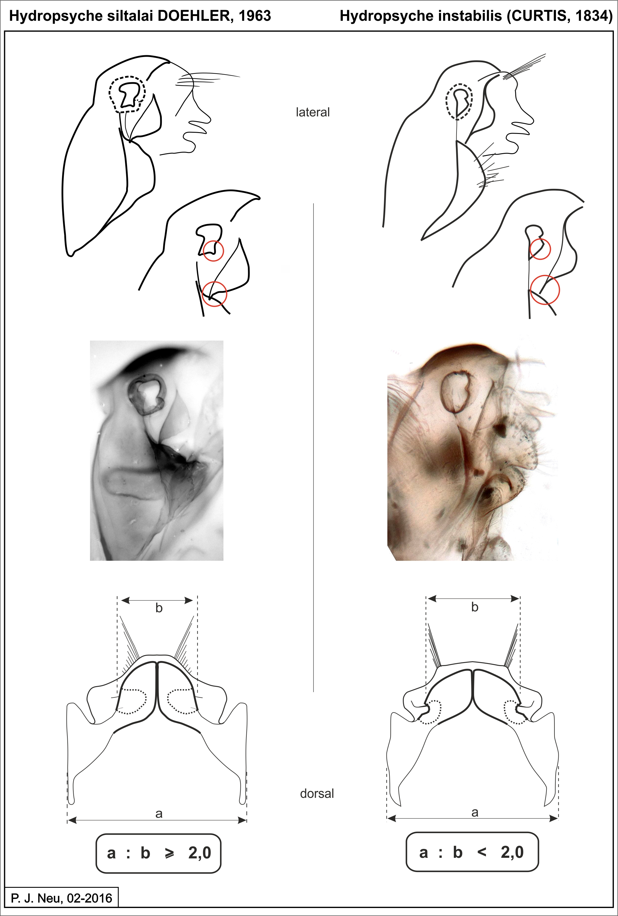 Wer öfter Hydropsyche-Weibchen bestimmt, für den ist die Unterscheidung von Hydropsyche siltalai DOEHLER, 1963 und H. instabilis (CURTIS, 1834) unproblematisch. Nachfolgend eine Tafel mit gegenüber der Hydropsychidae-CD (NEU & TOBIAS, 2003) optimierten Merkmalsdarstellungen zum privaten Gebrauch.